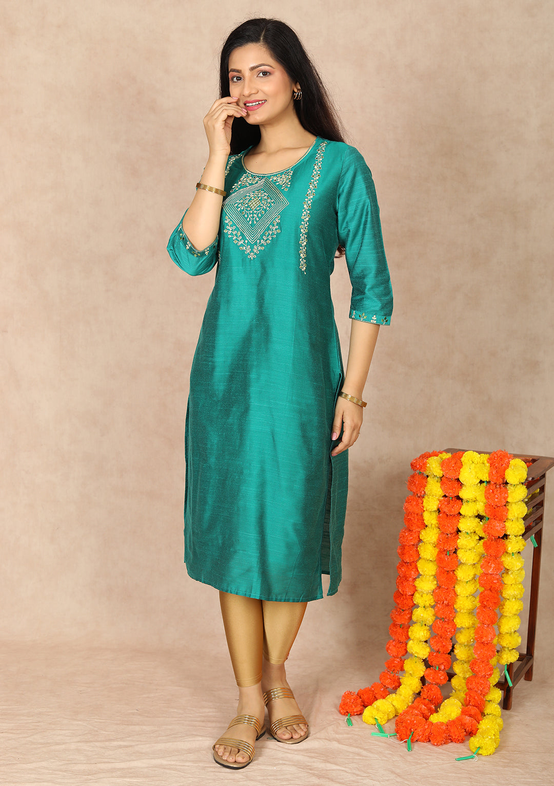 - Straight Cut Kurti with Round Neck And 3/4th sleeve