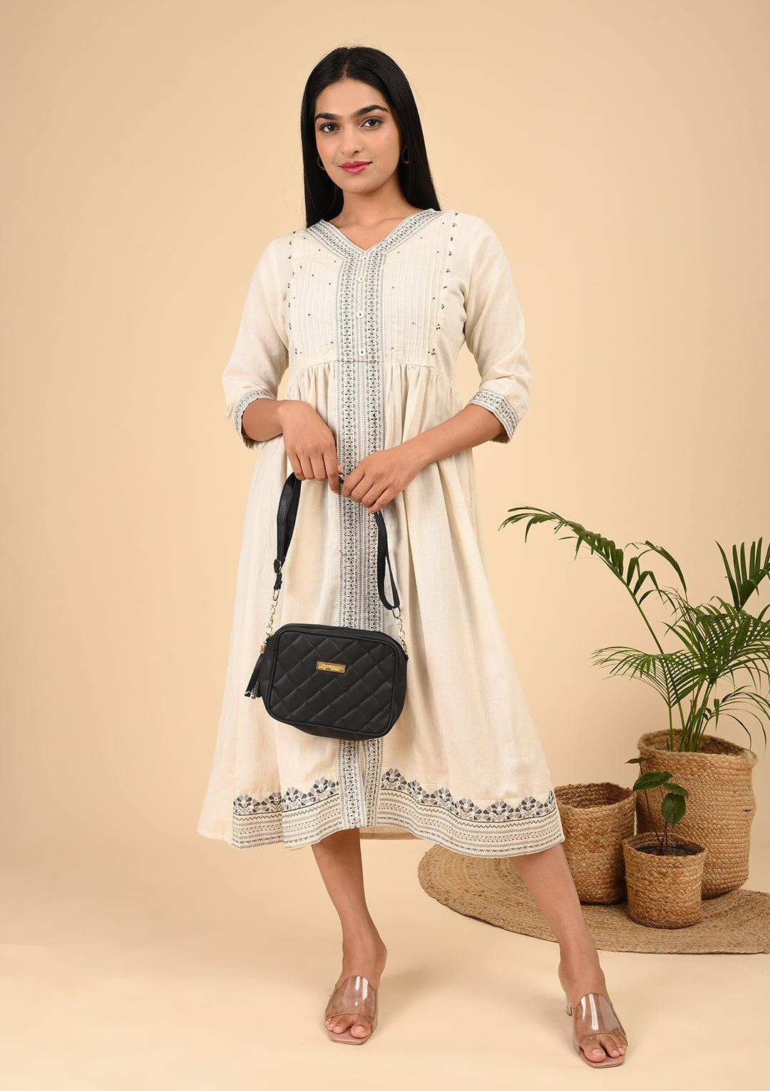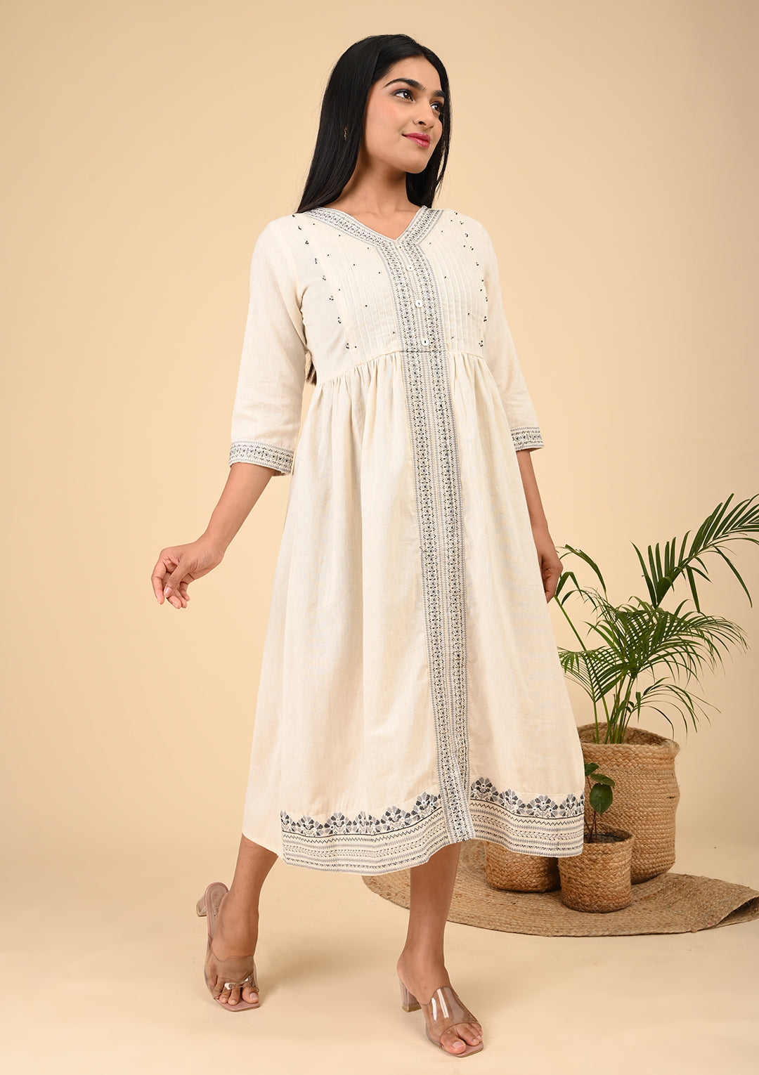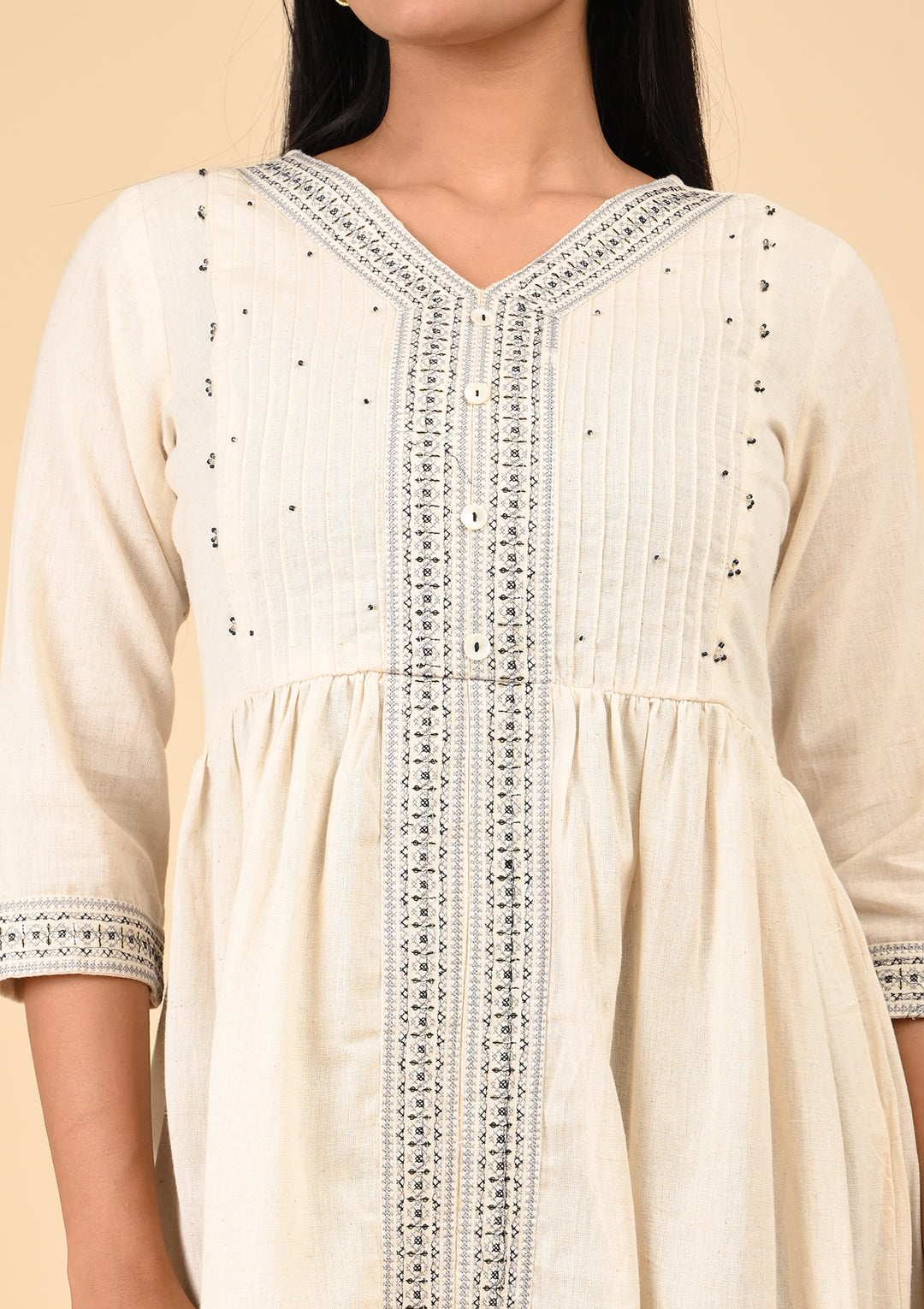 Step into effortless elegance with this ivory beige midi-length kurta designed for the modern woman who admires timeless craftsmanship. Made from soft, breathable cotton, this kurta features intricate thread embroidery along the front placket and hemline, delicate pintuck detailing on the bodice, and fine mirrorwork accents. The gathered waist adds a flattering flow to the silhouette, creating a graceful flare ideal for festive lunches, casual outings, or office ethnic wear.