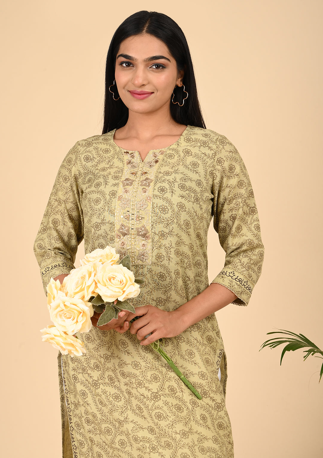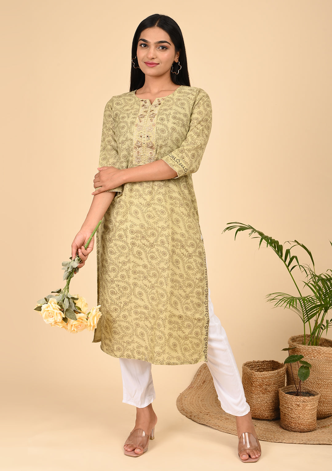 Elevate your everyday ethnic style with this graceful mustard beige straight kurta. Adorned with an all-over floral block print, this kurta is crafted from premium breathable cotton for all-day comfort. The notched round neckline is highlighted with delicate mirror work and embroidery on the placket, adding a festive yet elegant charm. Finished with subtle sleeve embroidery and side slits for ease, it's the perfect blend of simplicity and sophistication. Pair it with white pants and minimal heels for a refreshing ethnic look.